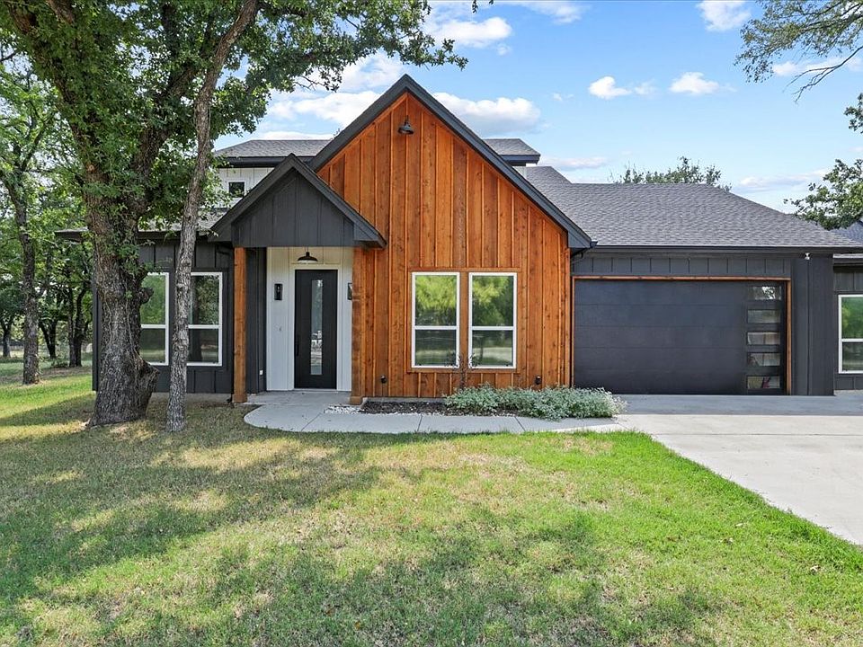 Inside, soaring ceilings and large windows create a bright, welcoming atmosphere while showcasing views of the surrounding trees. The living room centers around a striking fireplace, offering a warm and stylish gathering space. The kitchen is equally impressive with custom cabinetry, a spacious island, walk-in pantry, and elegant finishes that make both everyday living and entertaining a delight. The primary suite, located on the main level, serves as a private retreat with a spa-inspired bath and generous walk-in closet. Upstairs, three additional bedrooms and a full bath provide comfortable accommodations for guests or flexible use. A dedicated office and thoughtful touches throughout, including a mud bench, walk-in closets, and modern efficiency upgrades, add to the home’s appeal. Outdoors, enjoy the natural beauty of the wooded lot with plenty of room to relax, play, or simply take in the quiet surroundings. A two-car garage and an in-ground sprinkler system make daily living convenient. Experience the best of both worlds with a modern custom home embraced by nature, offering true privacy and no city taxes.