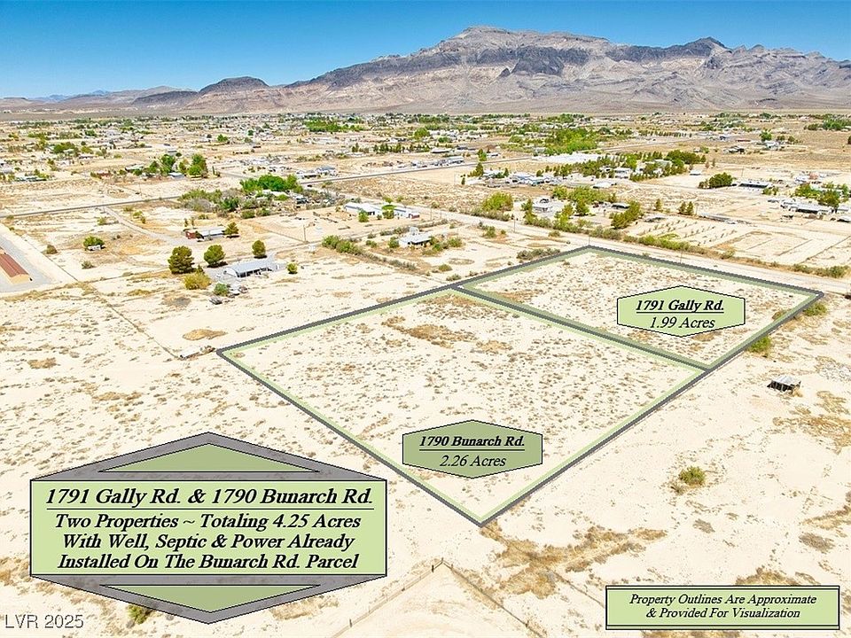 Up For Grabs Are Two Adjoining Parcels, Totaling 4.25 Acres, With Well, Septic & Power Already Installed~~~1791 Gally Rd. & 1790 Bunarch Rd. Are Located In Beautiful Northwestern Pahrump & Situated Among 2 Acre Parcels~~~These Two Need To Go Together As They Did Not Complete Bunarch Rd. & Accessing That Parcel Needs To Be Done Via The Gally Rd. Parcel~~~The Well, Septic & Power Is Installed On The Bunarch (Rear) Property &, Together, Offers Over 180,000 Sq. Feet For Your Pahrump Plans~~~The Mountain Views Are Spectacular In This Area & It Is Located 10 Minutes From The Center Of Town~~~Ask About Local Lenders That Are Now Offering Land Loans With 20% Down~~~Take A Look At The Pictures & Make A Plan To Make This One Yours Today!