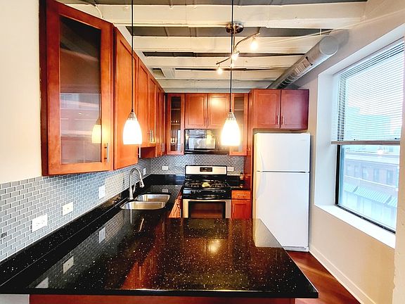 You will not believe just how spacious and fantastic the floorplan for this beautiful 2bed/2bath condo is. There's plenty of natural light. You will will be in awe by the beauty of this building as soon as you walk in. It's immaculate, clean and well maintained. Storage in basement, and elevator. There are parking/ garage space option nearby for rent. Security cameras surround the building, secured front and back entry. Other features include cherry hardwood flooring, sliding door that leads to balcony, high ceiling, maple cabinets with black granite countertops, washer and dryer. It is located at the perfect location. Steps away from grocery shopping, gym, restaurants and CTA bus routes. Minutes away from the train transportations, Metra, and the Lakefront. In building amazon hub. You ask for it and this unit has it to offer!