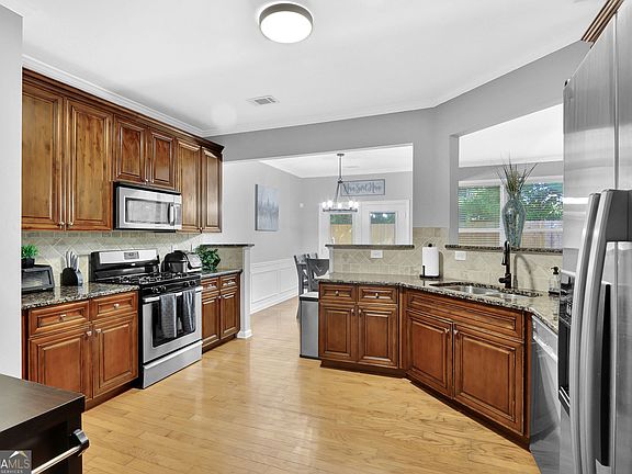 Welcome home to this amazing town home in Kennesaw . This open concept floor plan features a spacious Family Room, Dining Room and Breakfast area - perfect for entertaining and everyday living! Family Room offers gas log fireplace and an abundance of daylight. Separate Dining Room is open to Family Room. There's a half bath and coat closet in the hallway. This "perfect work triangle" Kitchen features granite counters, stainless steel appliances, and large pantry. Generously sized Laundry Room is conveniently located upstairs. The oversized primary suite features large walk-in closet and roomy primary bathroom with separate tub and shower, double vanity with lots of counters space, linen closet and semi-private toilet. There's space in the attic for extra storage and 2 car garage. Swimming pool, yard maintenance, fitness facilities, water, sewer, and trash pick up included in the HOA dues for low maintenance living. Ellison Lake - just beautiful, and right across from your front door. Convenient to Kennesaw Mountain Park, Kennesaw State University, Kennestone Hospital, I-75, and I-575, Marietta Square, and Barrett Pkwy. New roof 1/2025