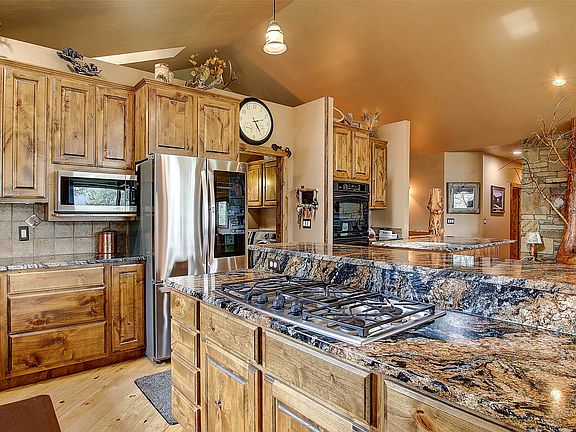 For those who like to spend time outdoors, the fun starts here! There is custom hardscaping everywhere you look. Make a pizza in the outdoor pizza oven, play horseshoes or hang out with friends in front of the Rumford Fireplace or firepit. Or simply sit on the deck or porch and watch wildlife, listen to the wind in the trees and relax. Wherever you are on this property, you will be amidst natural beauty, views for miles and quiet solitude. 2522sf of high-end, main floor living with a huge open concept great room and chef's kitchen. Not only is the kitchen beautiful with Alder cabinets and granite counter tops but it functions easily with several prep areas and a beverage bar. Vaulted ceilings and windows throughout bring in natural light. Hickory wood floors compliment the extensive rock fireplace that houses an indoor pizza oven.