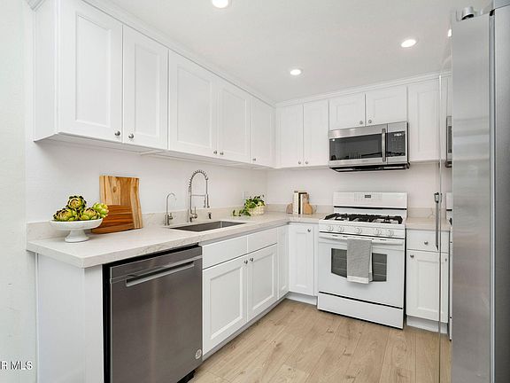 Light-filled and inviting, this single story condo features luxury vinyl plank flooring and recessed lighting throughout. The renovated kitchen boasts new cabinetry, quartz countertops, a new microwave and dishwasher, and an updated, modern aesthetic.