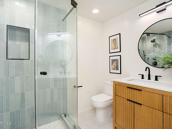 The spacious primary suite offers a spa-inspired ensuite with designer Bedrosians Cloe tile, dual sinks, and a wall-to-wall closet. The second bedroom and bath are equally refined and serene, with premium finishes and a calming ambiance.