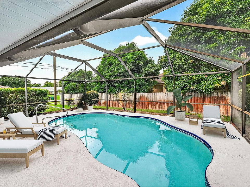 Discover your slice of paradise in this beautiful 3+den/2 bath pool home, spanning over 2,000 sq ft of comfortable living space. Soaring ceilings & skylights make it light & airy, with sliders that open up to a 42' lanai and screen enclosure. Great for indoor/outdoor Florida living around the pool! Glam kitchen with stainless appliances and bar seating flows to the family room. Split floor plan includes spacious master suite & luxe bath. New upscale laminate flooring throughout too! Updated AC and water heater. Roomy .30/acre corner lot with lots of parking space. Bring your toys!