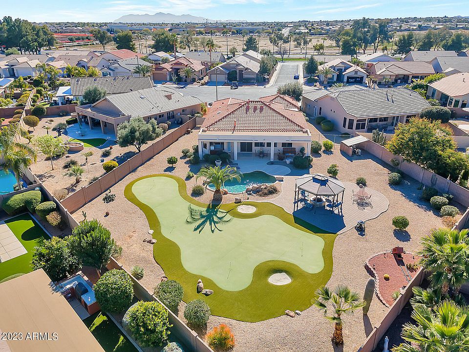 beautifully and professionally designed, 18,578 sq ft lot with extra-large backyard with inviting pool and waterfall, huge putting green with bunkers, gazebo, fire pit, extended back patio, pavers, Kool