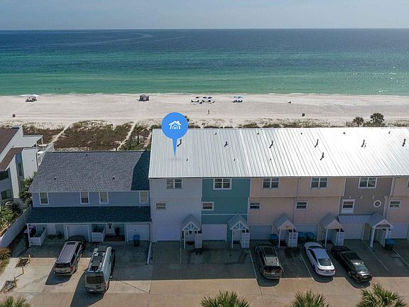 'CURRENTLY UNDER CONTRACT, SELLER WILL CONSIDER BACKUP OFFERS' West Panama City Beach Gulf front townhome 2 beds/2.5 baths and 18 linear feet on the Gulf of Mexico. Enjoy the beautiful views of the beach and stunning sunsets from the Trex deck. The lower decks offer covered and open areas for grilling and gathering, plus an outdoor shower. The second floor consists of the main living area, complete with kitchen, dining, living and a half bath, and spectacular beach views from inside and outside on the Trex deck. The third floor offers two bedrooms, two bathrooms, laundry closet, AC, water heater and owner's closet. Enjoy waking up to a view of the beach from the primary bedroom. Beachside West is a smaller gulf front complex of only 15 units. There's no HOA and no dues or fees. It's Fee Simple, you own the land and the unit. Freshly painted exterior Spring 2024, new roof 2023, new upper and lower decks in 2022. The two car garage could be converted in to living space, bedrooms, etc and still maintain a single garage or storage area. This is a great opportunity to own a desirable property in an ideal location on Panama City Beach.