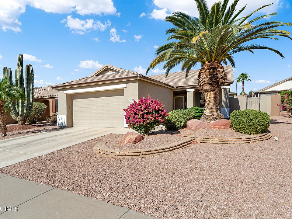 Beautifully maintained 2 bedroom, 2 bath home in over 55 Arizona Traditions. Fireplace in living room, open kitchen, cozy front porch. Master has walk in closet, double sinks, and walk in showwer. Back yard is fully fenced with extended patio & orange tree. Furniture available for turn key home. New roof in 2023. Community features golf course, pools, fitness classes, bar, clubs, tennis, softball, pickleball, bocce and more.