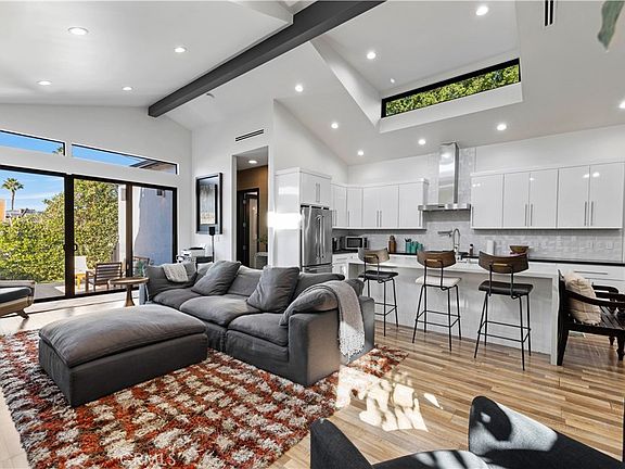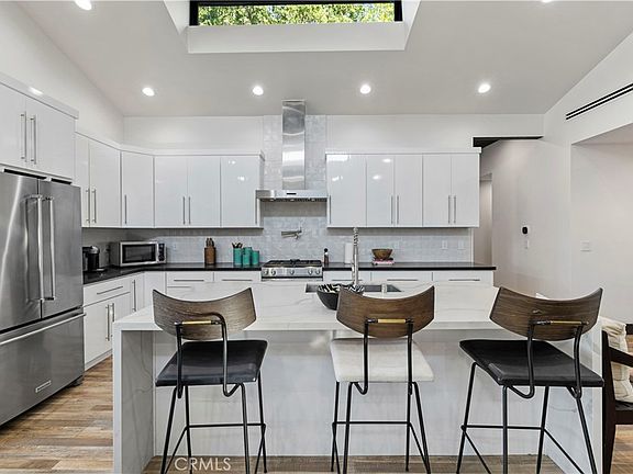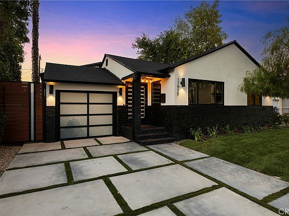 Welcome to 17929 Martha Street, an exquisite smart home where comfort, sophistication, and style are paramount. From the moment you arrive, thoughtfully curated finishes and designer touches elevate every space. The formal living room, overlooking the lush front yard, offers a calm and inviting setting for guests, while a large barn door provides a seamless transition between this cozy retreat and the expansive great room. The great room serves as the heart of the home, creating an elegant setting for dinner parties and luxury entertaining. The large kitchen is a true centerpiece, featuring abundant cabinetry, striking black quartz countertops, and an oversized waterfall island with seating for up to six. A pot filler above the stove adds both convenience and a touch of modern luxury. The expansive family room is flooded with natural light, highlighted by vaulted ceilings, large picture windows, dormer windows, and stationary glass panels that frame wall-to-wall sliders—perfectly blending indoor and outdoor living.