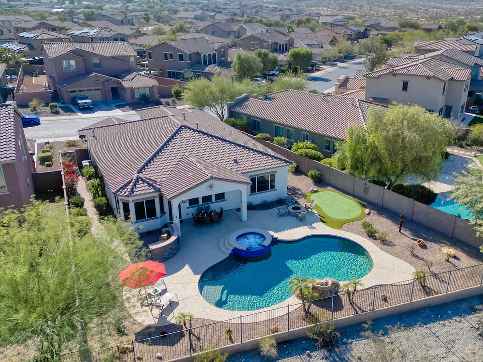 Welcome to this OPEN AND INVITING, beautifully appointed four-bedroom home with an amazing private backyard oasis. Relax in your OASIS, featuring a SPARKLING PEBBLE TEC POOL and SPA with a spillover, a stone water feature, and a putting green. Enjoy the tranquility at nights with beautiful lighting, a fire pit, and a built in BBQ. Notice the flow of tile flooring with a plank style wood look, beautifully appointed fixtures throughout and two-inch wood blinds. The large kitchen boasts of rich looking raised panel maple cabinets, granite counter tops, a stainless appliance package, an island with seating and a pantry. Both bathrooms have been updated. Notice the bold sliding barn door as you enter the primary suite bathroom that has an oversized designer tiled shower with a glass side. The space also has bronze faucets, updated bronze fixtures, double sinks and a spacious walk-in closet. The home has been well cared for and used only seasonally. The resort-style Presidio Residents Club is just minutes away. So many amenities in Estrella Mountain Ranch from the Yacht Club, lakes, recreational centers, water parks and golfing. Make this stunning home yours!