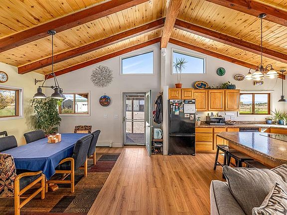 Beautiful Home • Heated Shop • Irrigated Acreage • RV Income • Optional Adjacent Lot Available. Views, functionality, and craftsmanship define this beautifully designed property. The 2-bedroom, 2-bath home is GPS-positioned for passive solar design—capturing winter warmth while staying cool in summer. Inspired by Hawaiian-style architecture, the interior walls stop short of the ceiling to promote natural airflow, light flow, and cross-ventilation, creating a bright, open feel. Inside, tongue-and-groove wood ceilings, a spacious open kitchen, and a cozy gas fireplace make it feel instantly like home. The covered porch is framed by mature landscaping and captures sweeping mountain views—a perfect place to unwind. A detached two-car garage, currently used as a gym, includes heating, plumbing with a toilet, sink, and hot water heater, providing flexible space for hobbies, guests, or workspace. The impressive 4000 sq foot heated shop features flooring with 7 inches of 4500 PSI concrete, high-bay LED lighting, and 14’ x 15’6” drive-through doors at each end—ideal for large equipment, RVs, or a working studio. The irrigated farmland has been organically fertilized for 4–5 years and maintains solid crop records. The current owners grow hay and graze 10–12 cow-calf pairs through the winter using gated pipe and underground water delivery. Three RV spaces, each with its own electric meter and county-approved separate septic system, generate reliable monthly income of $700 per site. An adjoining 4.325-acre parcel is also available and includes utilities in place and a build-ready site, plus four additional RV spaces with separate electric and water connections. This rare opportunity allows you to expand your operation, build an additional home, or create a multi-generational compound. This exceptional property checks every box—irrigated acreage, income potential, energy-efficient design, and panoramic views that embody the best of Western Colorado living.