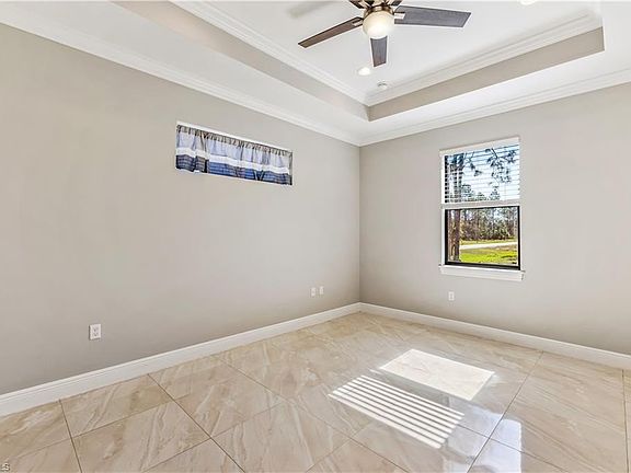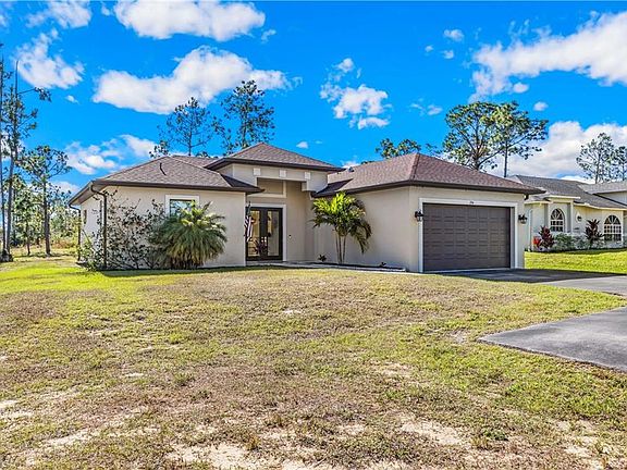 Situated on a 1.59 acre corner lot, imagine the peace and quiet, plus lots of outdoor space you will enjoy in this beautiful move-in ready home. And, it's just a five minute drive to pickleball, tennis, a huge children's playground and soon to be waterpark at Big Corkscrew Island Regional Park! This five year old, 3 bedroom plus separate den/office features plenty of natural light, high ceilings, designer soft close kitchen cabinets, granite countertops, tray ceilings, crown molding, laundry room, a water softening system, and much more. Add pocket doors in the primary bedroom, modern light fixtures and fans, and a ring video doorbell to the list of amenities. Located in a rapidly growing area of Golden Gate Estates, minutes away to shopping, restaurants, and schools. This is a must see!