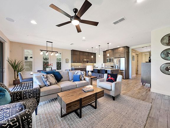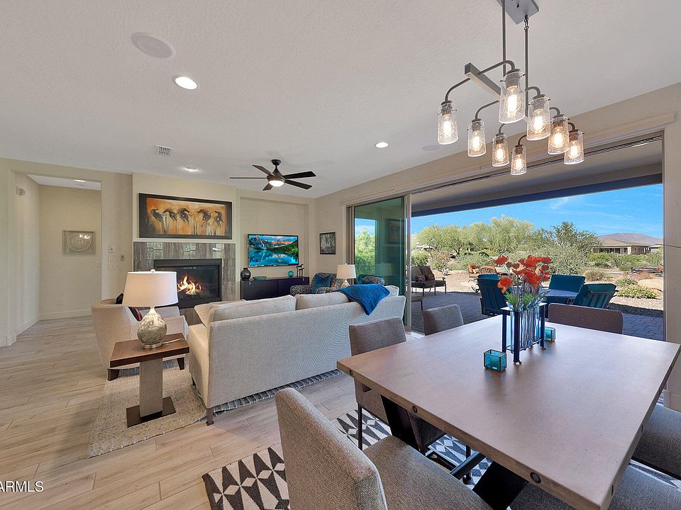 Enjoy stunning Four Peaks mountain views from the private backyard of this immaculate home in Trilogy at Verde River. Built in 2019 and sold fully furnished (with limited art exclusions), this residence is ideal for seasonal ownership or full-time living. The backyard retreat features an extended covered patio with pavers, built-in BBQ, mature landscaping, and direct access to the community walking path with views of Four Peaks mountain range. Inside, an open-concept design showcases a family room with pocketing doors, decorative tile fireplace, and wood-look tile flooring in all the right areas. The kitchen offers granite and quartz countertops, GE stainless-steel appliances, a gas cooktop, center island with seating, and a custom pantry with built-ins.