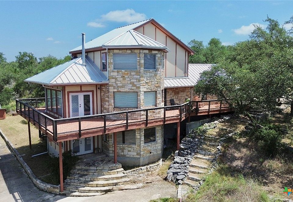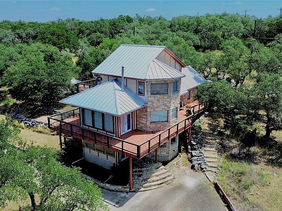 VIEWS for days! This stunning 3-story home on 6 private acres in the Falconwood subdivision is truly one-of-a-kind, surrounded by wraparound decks on every level to soak in the Hill Country scenery. Inside, you'll find expansive windows, multiple living areas, and standout features like an elevator, wood-burning stove, and three separate A/C units for ultimate comfort. The open floor plan offers flexibility-with potential for 3 bedrooms or private guest accommodations-plus a spacious garden area, spa, and two oversized concrete driveways. Recent upgrades include a new metal roof and new windows installed in 2024. The primary suite features a charming clawfoot tub, adding vintage elegance to your private retreat. The bottom floor includes a convenient kitchenette, perfect for guests or multi-generational living. With both attached and detached garages, granite counters, double vanities, and even the possibility to add a second guest home, this peaceful Hill Country escape is a rare and joyful find in San Marcos!