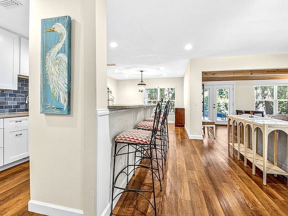 Wooded trailQuartz countertopsBead board trimTongue and groove ceilingFrench doorOpen patioLow-step shower
