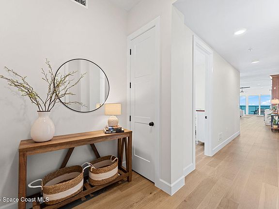 Built in 2022, this NE-corner condo delivers a modern beachfront lifestyle with unobstructed views of the ocean & rocket launches. Elevated 10' ceilings & floor-to-ceiling glass frame the horizon, while sliding doors open to a nearly 300 sq ft terrace that blurs the line between indoors & out. High-end finishes define every space, from custom cabinetry, quartz counters & stainless appliances in the kitchen to the custom bar/buffet at dining, built-in media center, window treatments & closet systems. Impact-rated glass, 1 ¾ solid core interior doors & concrete block walls provide peace of mind, complemented by fire sprinkler protection for safety. Community amenities elevate every day with a clubhouse, fitness facility, heated pool, hot tub & putting green. Blending sleek style with coastal ease, this residence is designed for both comfort & connection, offering an unmatched opportunity to embrace oceanfront living at its most effortless.