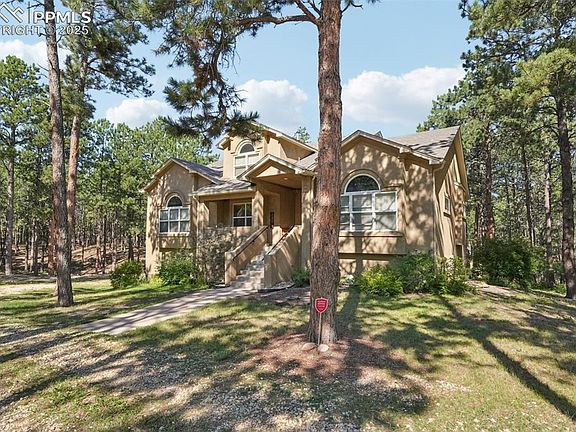 Quietly nestled on 2.82 acres of mature Ponderosa pines, this 1999 custom home offers timeless craftsmanship, privacy, and a lifestyle rooted in the beauty of Monument’s Tri-Lakes region. With 3,834 sq ft, it features 4 bedrooms, 3.5 baths, a finished walkout basement, and a three-car garage—built with enduring materials and meticulous attention to detail. Inside, the coffered-ceiling dining room easily accommodates up to 18 guests, perfect for gatherings. The open layout flows from casual living spaces to formal entertaining areas, while a laundry chute in the master bath adds convenience. The finished walkout basement opens to a second poured-concrete patio, creating a seamless indoor-outdoor experience. Outdoors, pebbled walking trails wind through three private sitting areas, two riverbeds, and wooden bridges leading to a dry basin—often visited by roaming deer. Towering evergreens provide year-round privacy, and winter brings over 110 inches of snow-blanketed charm. Located just 9.4 miles from the U.S. Air Force Academy and minutes from Garden of the Gods, the home offers an easy commute to Colorado Springs or Denver via nearby Highway 105. A small community HOA maintains a friendly, low-restriction atmosphere. Here, you’ll enjoy mountain views, fresh air, and a true connection to nature—without sacrificing access to top-rated schools, conveniences, and regional landmarks. If you’re seeking tradition, space, and serenity in one exceptional package, this Tri-Lakes retreat delivers.