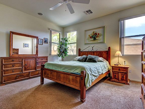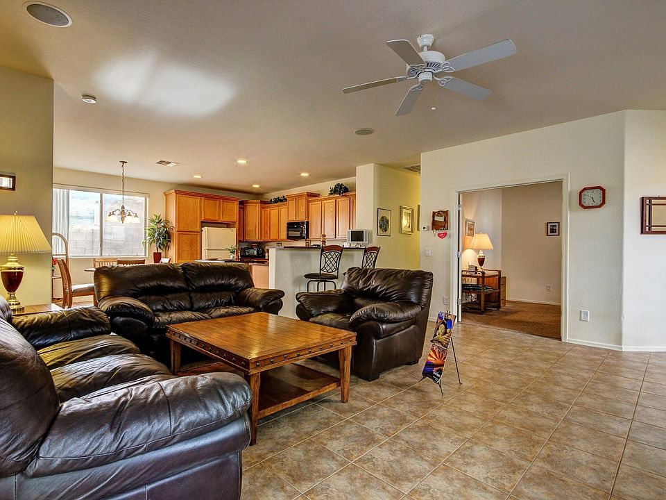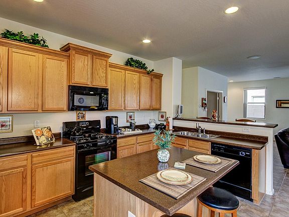 Desirable open floor plan with 4 bedrooms and split MBR. Kitchen has an island, breakfast bar plus dining area, gas stove, staggered cabinets with crown molding and recessed lighting. All appliances convey! Tile throughout except bedrooms! Surround sound in family room, MBR and patio! MBR is spacious, bathroom has double sinks, upgraded lighting and walk-in closet! Beautiful low maintenance yard with covered patio and plenty of colorful bushes and plants. Garage has epoxy floors, sink and house is pre-plumbed for soft water. Located only 1 block from community park/playground.