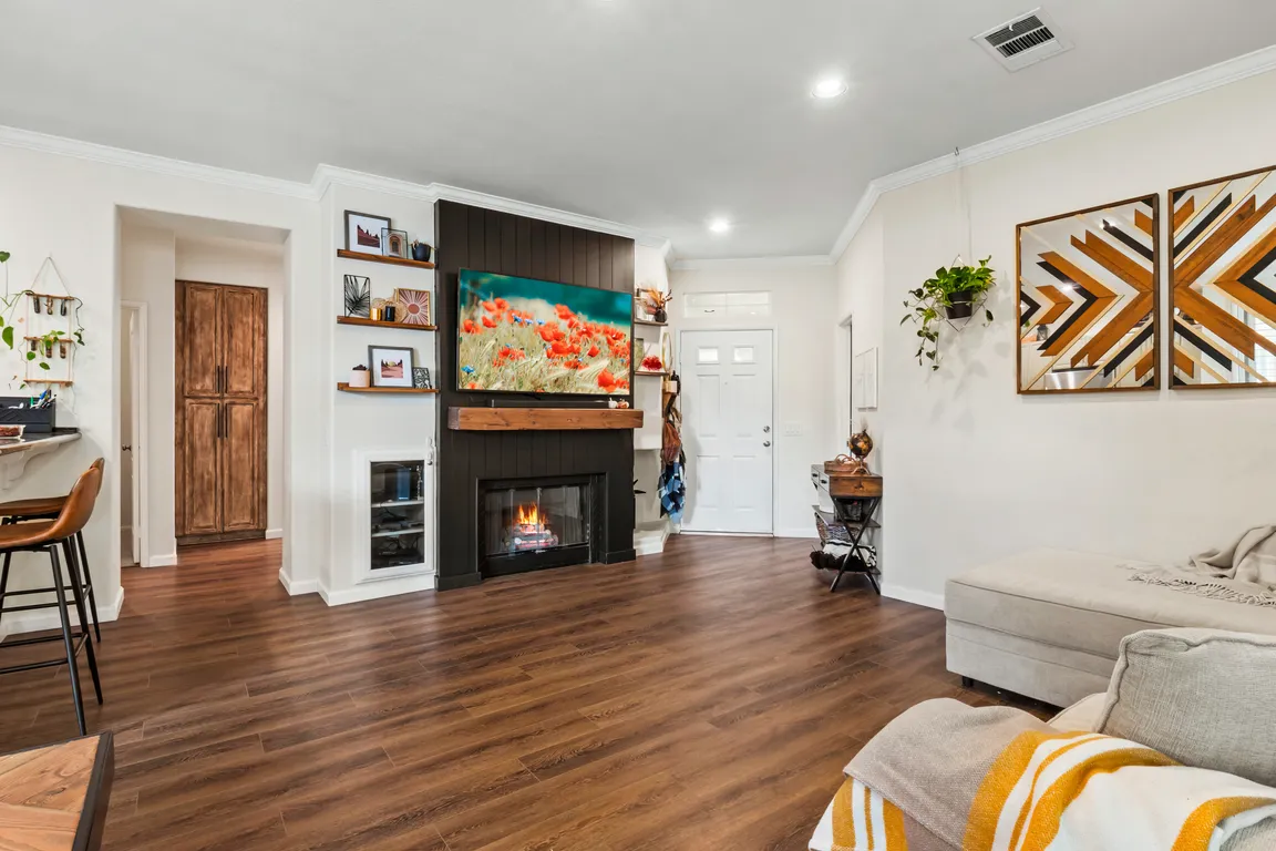 Private balconyNew water heaterBuilt-in media cabinetCharming wood-slat nookBreakfast bar seatingFresh paintCrown molding