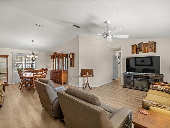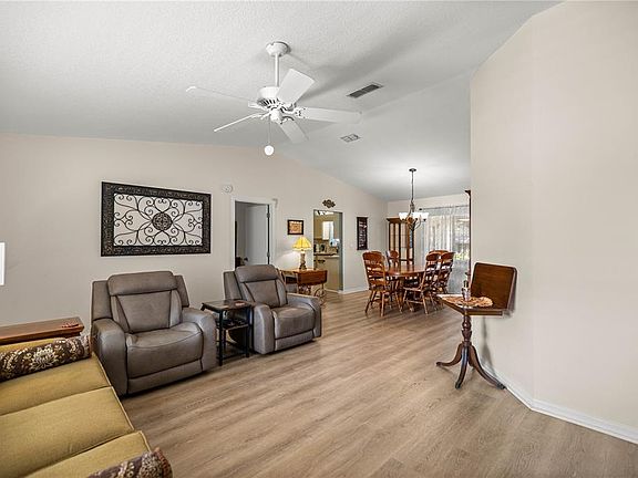 ~~~Welcome Home~~~ This charming 3-bedroom, 2-bath home is nestled in the desirable Spruce Creek community! From the moment you step inside, you’ll appreciate the luxury vinyl plank flooring, volume ceilings, and the bright, open layout that feels both comfortable and inviting. The kitchen is a standout, featuring granite countertops, a stunning backsplash, Roof 2022/2023 and Water Heater 2022, AC 2013, stainless steel appliances 2023, a large sink, and no popcorn ceilings throughout. Enjoy year-round comfort in the enclosed lanai, enhanced by a portable LG AC unit, perfect for relaxing or entertaining. Step outside to your fenced-in backyard, ideal for your little fur babies to play safely, and take advantage of the extended patio – great for barbecues and gatherings with family and friends. Additional features include, No Popcorn on Ceilings, Inside Laundry and Gutters around the entire home. This home gives you access to a lifestyle rich in amenities. Enjoy the 18-hole championship golf course, heated resort-style pool and spa, tennis and pickleball courts, and a 25,000 sq ft clubhouse featuring a fitness center, hobby rooms, billiards, a library, and a ballroom for social events. With over 30 clubs and activities, walking trails, and golf cart access to nearby shopping and dining, there’s something for everyone to enjoy. This home also boasts a prime location just minutes from Walmart, BJ’s, medical offices, and daily conveniences. Enjoy Spanish Springs for nightly entertainment, live music, and a wide variety of dining and shopping options. Plus, Spruce Creek South is a golf cart friendly neighborhood—perfect for fun, convenience, and community living. This home is priced to sell – don’t miss out! It offers the perfect blend of function, comfort, and Florida charm. Schedule your showing today!