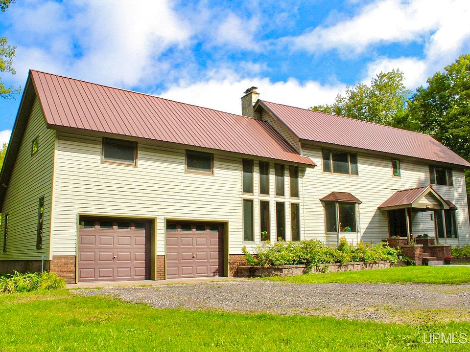 A beautiful home with an unbeatable location outside of Houghton! This four bedroom, four bathroom home on Springbrook Road provides plenty of interior space and acreage. It also has a pole barn with an attached lean-to and a firepit area. Step into the spacious main floor which has a beautiful view of the forest and creek below. The bright and remodeled kitchen has corian countertops and custom cabinetry. Newer appliances and furnishings throughout the home, yet with a classic and comfortable feel. Large living room with a sunken conversation pit and a powder room. Formal dining room is connected to the kitchen and entryway. There's also a space near the living room which has been used as an office. Stunning double story windows in the family room. There's a woodstove included in the family room as well. Laundry room/mudroom are also located on the main floor with convenient access to the two-car garage. There's an open studio space located above the garage which could be turned into living quarters. Take the staircase up to the second floor, where you can find the primary suite with an attached bathroom. In addition, there's a brand-new bathroom with a soaking tub and custom tile. Two other bedrooms round out the second floor. Head downstairs, where you can take the spiral staircase to the walk-out basement. There's a bar area and plenty of room with an office and additional storage. Also, you can find a large hot tub and sauna. There's a powder room and a bathroom with a shower. The tree-lined exterior features a paver patio with a flat yard, apple trees, and a peaceful forest with a brook. This property has an amazing location, with true country living yet only 5 minutes from the City of Houghton! Check out this fine home at an even better price today!