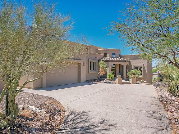 Exceptional 3BD/2.5BA +Den (2,858 sf) estate within the private, guard gated Wilderness Estates at La Reserve affords a striking Pusch Ridge backdrop plus spectacular mountain, valley & sunset views! Welcoming corner lot home on cul-de-sac street is situated on .60 acres and set back from the road. New Exterior Paint! This idyllic home showcases an Owner's wing with den/office (potential 4th bedroom) plus Guest wing with bedroom, hall bath and additional bedroom or den/office. Enjoy soaring, recessed and vaulted ceilings, formal living/dining room with walls of windows accenting the views, plus large Family Room off kitchen with corner kiva fireplace and wall-to-wall media center. You'll be greeted by a long driveway and dramatic circular foyer accented by soaring clerestory windows, chandelier and overheight entry door with beveled glass. Elegant Owner's suite with vaulted ceiling accesses main & side patios and hosts a spa-like bath with dual sink vanity, relaxing 'air bubble' soaking tub, glass block & tiled walk-in shower plus custom walk-in closet. Striking gourmet kitchen with vaulted ceiling and skylight hosts a diagonal set island, breakfast nook with views, Sub-Zero fridge and Dacor gas range, prep sink, plus built-in workstation and pantry. Additional amenities include skylights, art niches, clerestory windows, granite countertops in kitchen & baths, elegant powder room off foyer, extended laundry with sink, extended garage with built-in cabinetry plus zoned heating & cooling. Retreat to a serene rear setting boasting a Pusch Ridge backdrop plus covered and uncovered patios. A true desert retreat for the most discerning buyer!