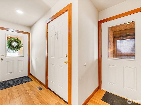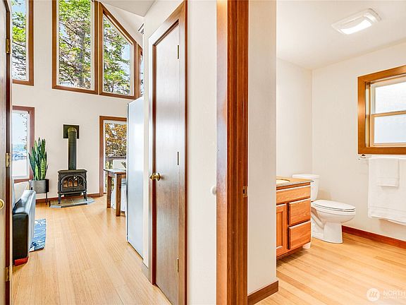 SPECTACULAR VIEW! PNW waterfront home with medium bank and beach rights—ideal for year-round living. Floor-to-ceiling windows frame breathtaking views of Skagit Bay, the Olympic Mountains, and Whidbey Island. Open-concept design with cathedral ceilings, stainless steel appliances, abundant natural light, main floor guest bedroom, and plenty of storage. Cozy freestanding gas stove and heat pump with A/C. Relax on the spacious deck with glass wind protection or stroll down the backyard stairs to the beach. Upper level features a primary suite with ¾ bath and loft/office. Upper level carpets have been removed and bathroom renovations are incomplete waiting for your finishing touches. BIA Leased land-50 year term. Estate sale—sold as is.