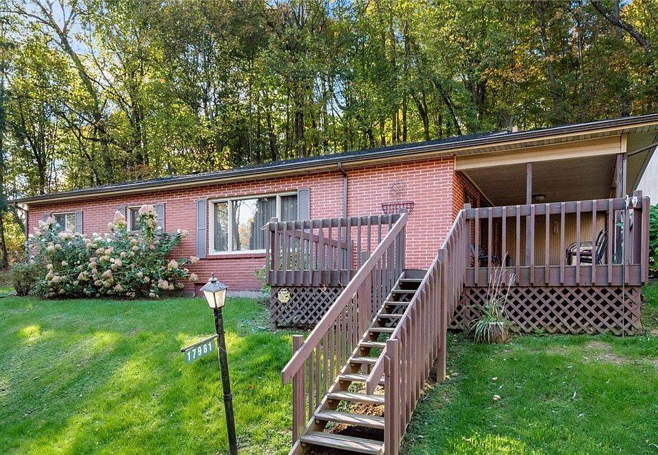 A front row seat to peace and quiet. Settled on just over 7 private acres in the beautiful countryside, this inviting 3-bedroom, 2-bath ranch gives you all the privacy you crave with the convenience of being only five minutes from downtown. Perched among mature foliage with plenty of space to breathe and unwind, you can make your way up the front stairs, passing a large deck and covered seating area overlooking the yard - imagine all the summer BBQs and quiet mornings you'll spend here! There's plenty of room to garden, explore, or just enjoy your own slice of country paradise. Inside, you'll find a warm and welcoming space rebuilt in 2012 with thoughtful updates. The kitchen is a real highlight, with rich dark wood cabinetry, granite countertops, a sleek tile backsplash, and bar seating at the peninsula that's perfect for casual meals or catching up with loved ones. The living room fireplace instantly draws you in, with its stone surround and rustic wooden mantle creating the perfect spot to curl up and relax after a long day. Just off the entryway is a bonus room that would make an ideal home office or cozy library. Outside, the oversized 32x32 two-car garage and workshop is ready for projects, hobbies, or a little extra storage. All known mineral rights will transfer, and if you're dreaming bigger, this property can be purchased together with the neighboring home on 1.25 acres, giving you over 8 acres total to make your vision a reality or expand your hunter’s haven with wildlife filling the area!