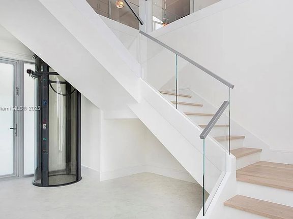 Direct gulf accessGlass-enclosed elevatorCustom es windowsStriking spiral staircaseWaterfront homeSolid aluminum roof