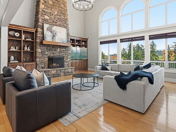 Stacked-stone fireplacesLarge backyardHome theaterSpa-inspired bathCustom millworkFull lower-level barFloor-to-ceiling arched windows