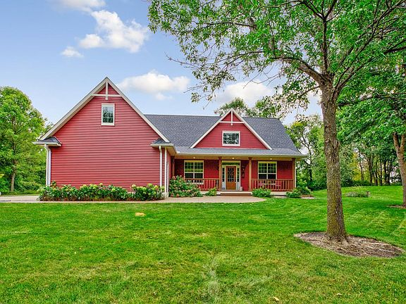 Welcome to your dream home, nestled on a picturesque 5-acre parcel where peaceful living meets rustic charm. This dreamy home offers the perfect blend of rural tranquility and modern convenience, as it's all on one level and right off blacktop! You'll be immediately captivated by the vibrant red exterior of the house, standing out against the backdrop of lush greenery and a welcoming front porch. Step through the front door and fall in love! Large rustic wood beams and a stunning stone gas fireplace lends a touch of country charm. Gather for meals and conversation around the kitchen island which leads to a tranquil screen porch and access to a picture-perfect backyard. The primary bedroom is a tranquil retreat! As if this all wasn't enough, note the detached shop + guest room, and deeded access to Hunt Lake just a short stroll away. A home that blends classic charm with outdoor adventure, it's truly a heavenly place to call home. Experience the magic of countryside living today!