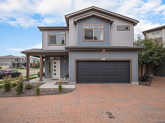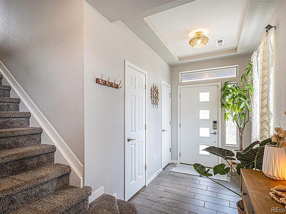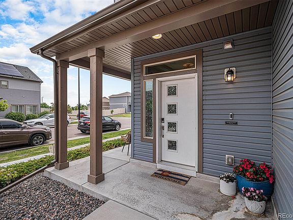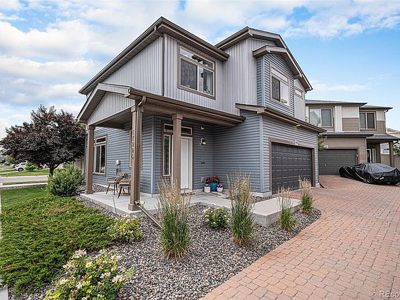 Built in 2018, this beautifully maintained one-owner home offers thoughtful upgrades and modern comfort throughout. Enjoy peace of mind with a new roof, gutters, and garage door, along with a low-maintenance yard featuring turf—plus taxes that cover snow removal and front yard landscaping. The bright, open layout is filled with natural light, enhanced by clerestory windows, and centered around a cozy fireplace that adds warmth and charm. At the heart of the home is a chef’s kitchen with KitchenAid appliances and an oversized island that seats six. A versatile flex area can easily be converted into a third bedroom or home office. The primary suite includes a full bath and walk-in closet, and the oversized garage comes equipped with custom shelving. All just minutes from parks, trails, playgrounds, DIA, light rail access, and located in a highly rated school district—with downtown Denver just 20 minutes away.