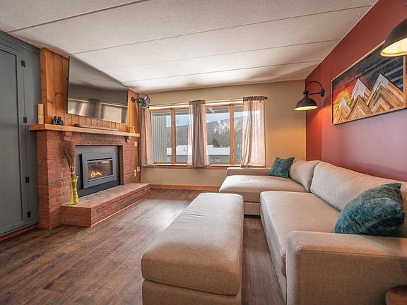 The Snowtree community is located right at the base of Mount Snow for tremendous downtime, not upkeep. This prime location affords easy access the mountain via shuttle or footbridge, year round, and prime mountain views looking right up at the trails. This gorgeous, updated, main floor unit is two bedrooms, two baths, and affords plenty of room to spread out, without being too much to maintain. Inside you are treated to an open concept living area with new gas fireplace and brick hearth with mounted flat screen television, direct views of the trails, a large set of built ins with lighting and desk, making use of otherwise empty space. new rustic flooring throughout, new barn style closet doors, a large updated kitchen with breakfast bar, slider out to the large deck for summer enjoyment, primary suite with vaulted ceilings, second slider to deck, full bathroom with new vanity and fixtures, and large walk in owners closet, second bunk room with additional closet space and full updated bath, an entry mudroom for gear and laundry, 3 direct vent and energy efficient propane Rinnais, and great main floor access. From the parking area you have easy access to the trash and wood sheds. The development does all landscaping and snow removal, building exterior maintenance, and has a recently updated amenities building with outdoor pool, indoor hot tub, exercise machines, and more. A great starting point for your ski adventure!