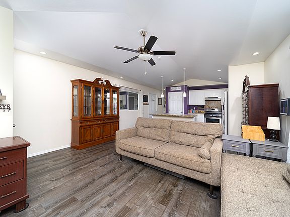 Open concept living area with vaulted ceiling.