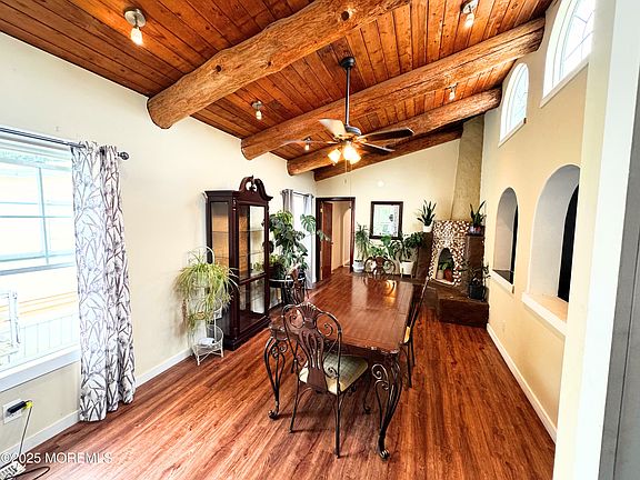Welcome to 18 Alexander Ave in Jackson, a spacious double-wide manufactured home in a desirable 55+ adult community. This home features vaulted wood-beamed ceilings, arched accents, and an open floor plan with a white kitchen, large living room, and formal dining area. Updates include a modern bathroom with tiled shower, second full bath, and new flooring. The oversized primary bedroom offers plenty of space, plus additional bedrooms for guests or office use. Enjoy a covered porch, private driveway, and community living close to shopping, dining, and major highways. Affordable, move-in ready, and full of charm—don't miss it!