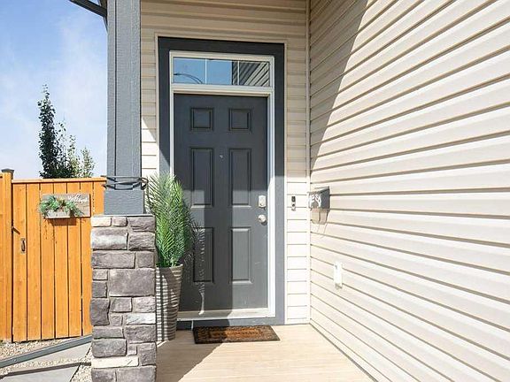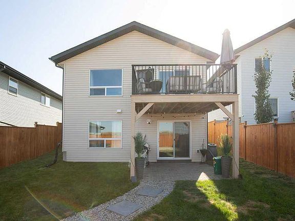 Discover your dream home in this modern Silverstone-built walkout, designed with your family in mind! Spanning 1,224 sqft on the main floor, this home offers a spacious open-concept layout, ideal for entertaining, with vaulted ceilings and sleek grey laminate flooring. The modern kitchen features dark cabinetry with soft-close drawers, tile backsplash, stainless steel appliances, corner pantry, and a central island with a sink. Enjoy 3 bedrooms upstairs, with the potential for a 4th and 5th downstairs, plus 2 bathrooms, including a luxurious 4-piece ensuite in the expansive master bedroom. Unwind on the rear deck, perfect for BBQs, or let the kids play in the fully fenced, landscaped backyard with walkout basement access. Additional highlights include a tiled entryway, tiled bathrooms, water softener, alley-access, off-street parking, and a tool shed for the yard equipment. In-floor heat and central vacuum roughed in, plus a builder's proposal for an additional 1,188 sqft basement development, this home is move-in ready with room to grow! Nestled in the thriving Town of Blackfalds, AB—just 10 km north of Red Deer—a fast-growing community, home to nearly 12,000 residents, including young families and entrepreneurs. Blackfalds offers top-rated K-12 schools, including a new high school, and a wealth of family-friendly amenities like the Abbey Centre, featuring a multi-sport complex, aquatic center, and library. Enjoy well-maintained parks, scenic trails, and improved transportation links for easy commutes to Red Deer or beyond. With shopping, dining, and recreational facilities all within walking distance, Blackfalds blends small-town charm with modern convenience. Schedule a viewing today to discover this exceptional home and the vibrant Blackfalds lifestyle—your family's new chapter starts here!