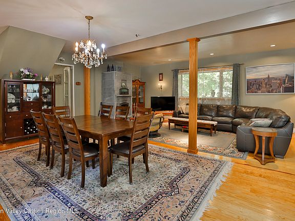 Walking about the property's vast 5.7 acres, you will come across all kinds of surprises requiring various levels of repair, including a guest house, garage, two tennis courts, swimming pool, pool house, and two pump houses. A sense of history pervades the property of Bella Vista, along with the potential of what could be. Do not miss this rare opportunity to own a true estate right across from Belleayre Mountain. The chandelier above the dining table is not included in the sale.