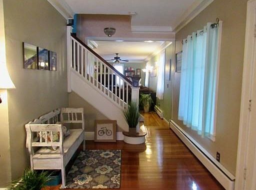 Welcome home to the charm of the old with the convenience of the new, featuring, 4 bedrooms and 2 baths. The main level flows graciously from, entryway, to dining room, kitchen, living room. Dining Room and Living Room Slider leads to a 50 foot stone patio/retaining wall that overlooks the back yard. Kitchen is complete with Newer Cabinets, Granite counters with Breakfast Bar, and Appliances. Renovations/upgrades include, conversion from oil to gas furnace with hot water heater, refinished hardwood floors, upgraded shower pluming in master bath, freshly painted exterior, added skylight in master bedroom, new gutters and Radon Remediation System. This property backs up to conservation land and is a walk to Lake Saltonstall and surrounding trails. First Showing Saturday, October 27, 11:00-1:00.
