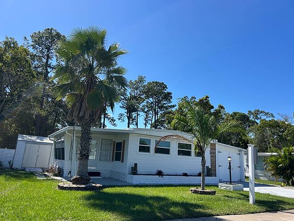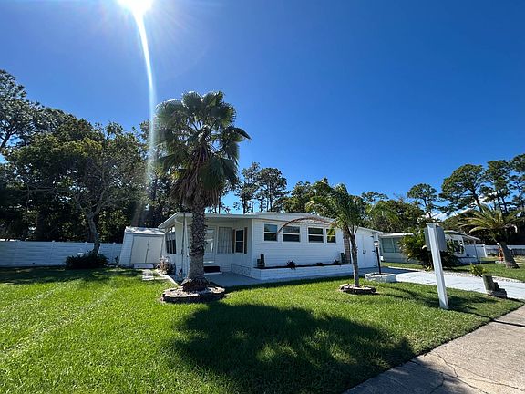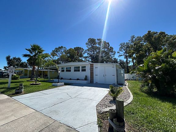 This cute clean two bedroom one and a half bath is a must see in a 55+ community with a clubhouse and pool. A spacious home that comes with an all weather Florida room with A/C. Great for entertaining, a new garage that was built up to hurricane code it's great for jet skis, small boat, motorcycles, cars, whatever your needs maybe. There's also an extra large laundry room attached to the garage that makes it very convenient. This home has plenty of storage spaces, there's a large shed with a Ramp & wide doors on side of property for extra storage. New A/C & duct work 2023, New hurricane code windows in the living & dining area, There is a well for the sprinkler system, it also can be plumbed to the main house for water supply. Kitchen has newer appliances, lots of cabinets & space great for cooking. Close to restaurants, shopping, medical, and minutes to the beaches and boat ramp. Make this cute little gem you're forever home or winter retreat. This home never flooded. Owners are motivated. Base lot rent is $1184-1207 depending on the lot. Additional fees are $16 Lawn care & $16.74 pass through taxes. ALL INFORMATION DEEMED ACCURATE BUT NOT GUARANTEED. Additional fees for amenities may apply. Agent and or Company is not responsible for quoting current monthly fees, lot rent, or dues/fees associated with the community or home. Those figures are the responsibility of the buyer and community manager/owner to obtain/ disclose.