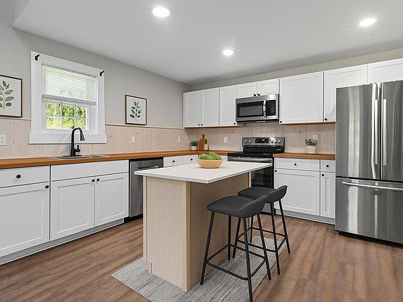 Built just a few years ago, the home has been lightly used and well maintained. Step inside to a spacious open-concept living area featuring cathedral ceilings and a beautiful wood staircase that adds to the home's warm, country appeal. The first floor includes a convenient bedroom and full bath, while the second floor offers two additional bedrooms and another full bath—ideal for hosting guests or creating your own work-from-home space.