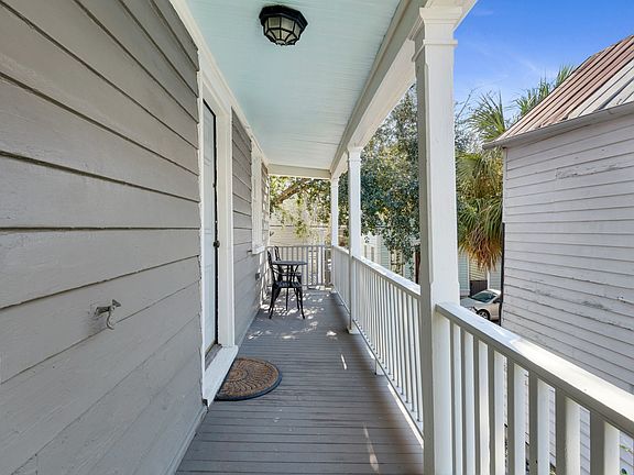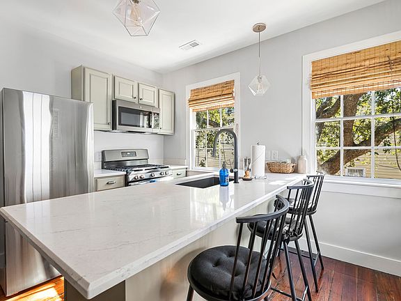This one bedroom, one bathroom apartment in Charleston's charming Elliotborough is perfect for someone wanting minimal space while still enjoying all that living in the city has to offer! This apartment is located on the second floor of a classic Charleston single home. Walk up the stairs and you are greeted by the spacious porch. This is the perfect place to people watch over tree-lined Bogard Street or enjoy a morning cup of coffee while enjoying the beautiful Charleston weather. Enter through the front door and you are greeted by the light filled, airy space. The living room features a comfortable couch and chair, perfect for lounging or watching a movie on the smart TV. The exposed brick fireplace, while not operational, adds loads of charm to the space. The kitchen is small yet equipped with all of the necessities, including stainless steel appliances, cabinet space, and even seating for three at the kitchen island. Just beyond the living room and separated by the fireplace is the cozy bedroom. Here you will find a full size bed, plenty of closet space, and a desk and chair for all of your work from home needs! The bathroom features a gorgeous tile shower and open shelving for storage. There is also a full size washer/dryer in the apartment.