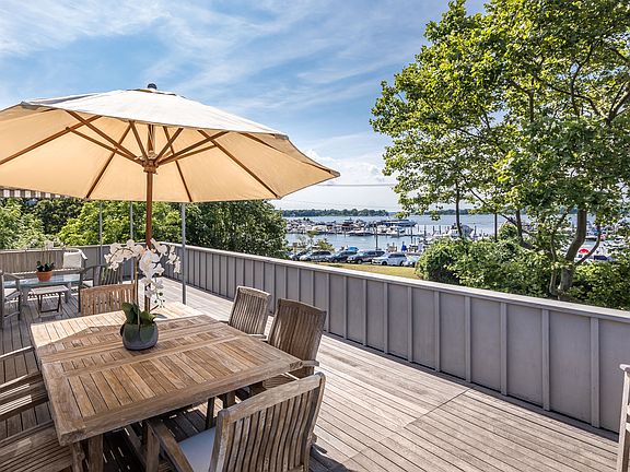 Imagine your own chic penthouse pied-a-terre, anchored in the heart of theVillage with an enormous sundeck offering extraordinary water views over the marina and Sag Harbor Cove with absolutely breathtaking sunsets all year long. This thoroughly beachy-modern 1322sf Duplex Penthouse, completely renovated top to bottom in 2016, is a turn-key 2 bed 2.5 bath condo, nestled into a surprisingly private landscape literally steps to all the amenities the Village offers. Distinctively detailed with lightly bleached oak hardwood floors, a built-in library wall, and custom cabinetry offering ample storage throughout. Loaded with thoughtful details, such as the leather wrapped staircase banister and custom builtins, utilizing every inch of storage. The stunning views on the second level are dramatic from every angle. The great room with wood burning fireplace is lined with a wall of glass sliders that open out to the ultimate 612sf mahogany entertaining deck with a fixed canopy to one side for shade. The sleek brand new professionally designed kitchen is expertly fitted with Gaggenau appliances, wolf induction stovetop and quartz countertops. There is a modern half bath and laundry conveniently located on this floor. On the first level are the 2 en-suite bedrooms; the master suite has its own spacious 144sf private deck with water views and plenty of closet space, along with a second en-suite guest bedroom with walk in closet. This is by far, the premier and largest unit in this development built by the builder for himself taking advantage of the unique location overlooking the Harbor. This unit comes with 2 coveted parking spots, located near the entrance as well as two storage lockers in the garage building. The grounds offer lush mature gardens for privacy. Enjoy the best Sag Harbor Village has to offer, restaurants, shops and marinas, just steps away from your front door. A unique Village opportunity not to be missed.