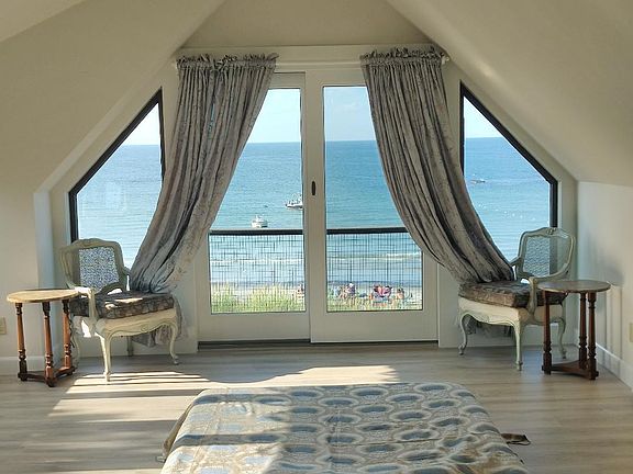 Ocean views 180 degrees from Cranes Beach to Annisquam River from Atlantic Ocean facing home, listening to waves rolling on soft sandy beach, Bald Rocks in center view. Modern kitchen fully stocked; dishes, silverware, cooking tools, placemats, tablecloths, with granite counters, stainless steel kitchen appliances; electric stove, new refrigerator, wine cooler, dishwasher, kitchen sink. Dining area seating 8, living room with working fireplace and wood in exterior bin, sliders from dining and living room areas to wrap around upper deck, great gas grill & two tanks, TV cabinet & modem. Play room on the lower level, two twin bunk bedrooms, playroom with TV cabinet, sliders to lower deck with utmost privacy, wrap around for path to the parking area and other di Just fully remodeled, two marble tiled bathrooms & one ceramic tile bathroom on playroom level, with access to outside hot & cold shower to rinse off the sand. Five bedrooms: main queen bedroom and guest double bedroom on upper level, one double bedroom on living level, two bunk bed bedrooms on playroom level, two upper twin beds, two lower full size beds, one additional twin in one bedroom Fully furnished kitchen, bedroom and bathrooms. Outside decks, upper wrap around deck with Beach and sunset views, dining table & chairs, vintage iron couch & chair, glass top dining table & four chairs and high top table with two chairs with dining and reclining furniture. Two minute walk around dunes to private Section of Wingaersheek Beach! Tenants responsible for utilities: propane for heat, electricity for appliances & lighting, Internet, TV, landline, snow plowing, cleaning monthly. Pet Policy: Separate Deposit, small, well behaved dog, damaged items replaced. No smoking of any type inside or on outside premises. Lease from 10/15/2023 to May 15/2024
