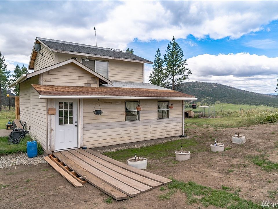 80 AC. 2 bed, 1 bath 1,400+ sqft home with top of the mountain views. 11 miles from Tonasket on County maintained roads. Solar with 10k generator system. Well with solar pump. 2-250 gallon water tanks. Nice garden area, chicken coop and dog kennel. Finished upstairs, kitchen, bath and dining room. Wood stove and propane for heat and cooking. Short distance to Okanogan Forest. Great hunting cabin or summer home. Finish this jewel, with the million dollar view.