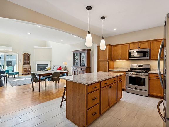 Enjoy the charm of downtown Kennebunk with this sun-drenched, inviting, townhome-style condominium. Featuring an open floor plan, this home includes an updated kitchen with newer stainless steel appliances, granite countertops and a large island for the chef in your family. A striking living room with soaring cathedral ceilings is complemented by hardwood flooring and a gas fireplace, making entertaining a breeze. The primary bedroom on the main floor boasts an attached bathroom with a large, newly-tiled shower and glass door, a walk-in closet and a laundry area. A half bath near the foyer and a built-in desk area add convenience, perfect for organizing essentials.