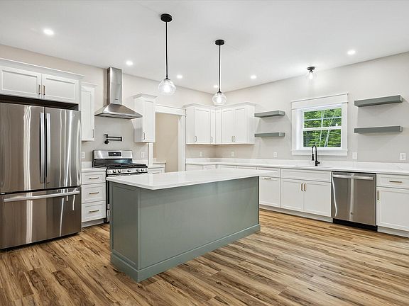 The open floor plan features a gorgeous kitchen with quartz countertops, custom Maine-made cabinetry, and a layout built for both entertaining and everyday comfort. The home is enhanced by luxury vinyl plank flooring and custom built-ins that add both charm and functionality.
