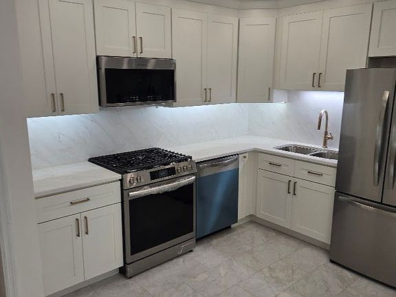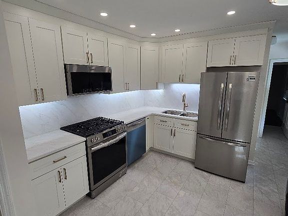 Fully renovated kitchen with stone countertops, a full stone backsplash with a sleek modern look, stainless steel appliances, gas range, under-cabinet lighting, and custom cabinetry.
