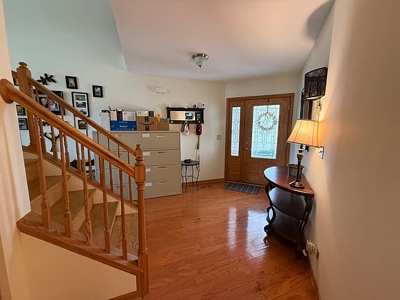 Open loftFirst floor laundryHardwood foyerCathedral ceilingsHardwood floorsStainless steel appliancesOak cabinetry