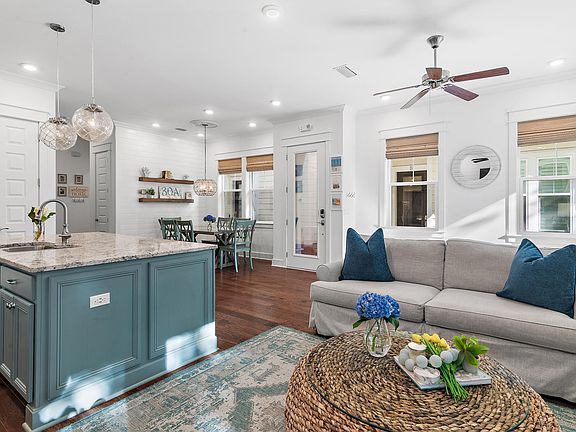 Turn-key with a 6-Seater Golf Cart! Experience effortless coastal living and immediate investment potential with this stunning unit, perfectly nestled in the resort-style community of Prominence on 30A. Sleeping 8-10 people comfortably, 'Let is Beach' seamlessly blends luxury accommodations with inviting coastal charm. Upon entry, the first floor is bathed in natural light, highlighting soaring ceilings, stunning hardwoods, shiplap accents and a beautifully curated color palette. Gorgeous interiors, complement the bright and airy atmosphere, while the gourmet kitchendesigned for both functionality and entertainingboasts elegant countertops, a striking tile backsplash, and a Frigidaire appliance package with a gas cooktop, and an extended island with integrated seating.