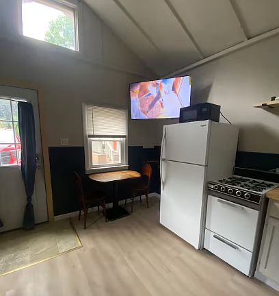 This unique guesthouse features a loft with a full size bed, futon on ground floor that folds out into a full size bed, kitchen, full bathroom, WiFi and cable TV.