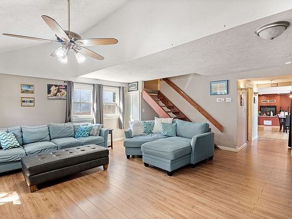 This spacious home offers over 2,300 square feet, 4 bedrooms, 2 baths, and a great yard space! As you enter the front door you are welcomed into the large living room with vaulted ceiling. Through the hall you have the bright, open concept kitchen / dining room with fireplace and floor to ceiling windows. Main floor also includes bathroom with double sinks, first floor laundry, primary bedroom, and an office/ gym. Second floor offers 3 generous sized bedrooms, bathroom, bonus room, and a walk-in closet/ storage room. Sliders off the dining room bring you to the large deck overlooking the yard. Great side street location with walking distance to the bus line and short ride to the commuter rail/red line.